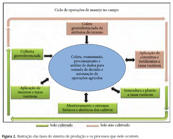 A Figura 2 exemplifica o sistema de produção e os processos que nele ocorrem. Informações georreferenciadas dos atributos do solo (características físicas, químicas e biológicas) são coletadas, transmitidas e analisadas para que sejam estabelecidas as capacidades produtivas de áreas do terreno; em função dessa análise informações são transmitas às máquinas e aos equipamentos para a aplicação automatizada de corretivos e fertilizantes em taxas variáveis. Em seguida ocorre a operação de semeadura/ou plantio (mudas) automatizada com a utilização de plantas adequadas às diferentes capacidades produtivas do terreno, i.e., para explorar a máxima capacidade produtiva do solo. Posteriormente ocorrem as operações de manejo da cultura. Os estresses bióticos (patógenos, insetos e plantas daninhas) e abióticos (deficiências hídricas e nutricionais) podem ser determinados e georreferenciados pela utilização de sensores remotos (por satélite, avião, Vant). Todas essas informações são armazenadas e transmitidas numa linguagem padrão de intercâmbio, e.g. AgroXML, para uma central para serem processadas (computação em nuvens, grid, paralela entre outros) e analisadas por um sistema específico de decisão, que encaminhará as decisões, em conformidade com o padrão ISOBUS, para as máquinas equipadas com sistema de direção automática e equipamentos, que realizarão as operações de aplicação georreferenciadas em taxas variáveis de insumos (água, fertilizantes, defensivos, agentes de controle biológico,etc). O ciclo é iniciado novamente após a colheita, com a utilização de sensores de produtividade e/ou de qualidade (conteúdo de proteína, óleo ou outro parâmetro) cujos dados são enviados à central de processamento para a obtenção de mapas.
