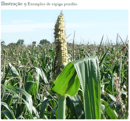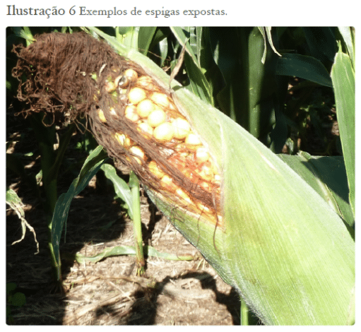 Espigas expostas (foto tirada após florescimento). Caracterizada quando a espiga mantém o alongamento além do final da palha que a protege. Este fenômeno faz com que a espiga fique mais suscetível a qualquer estresse, seja biótico (doenças e insetos) ou abiótico (altas temperaturas e deficit hídrico).
