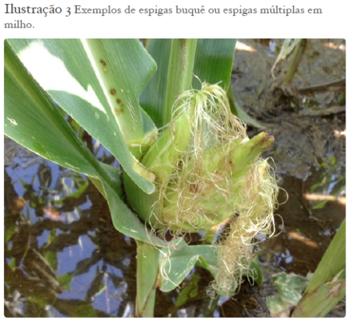 Buquê ou espigas múltiplas de milho em uma mesma haste. Os grãos em formação na espiga não se desenvolvem devido à falta de sincronia entre a liberação do pólen e a saída dos estigmas ("cabelos").