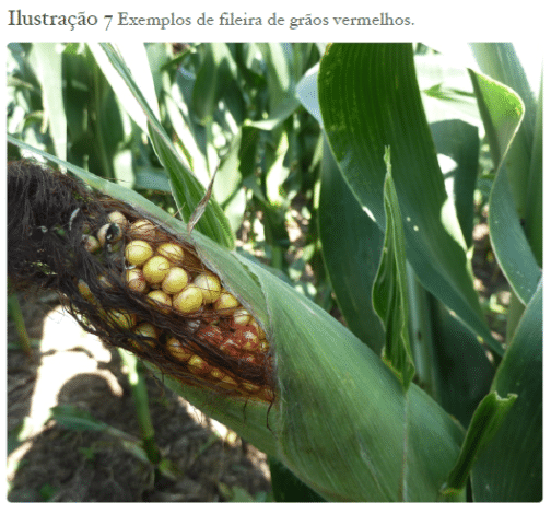 Fileira de grãos vermelhos em milho (foto tirada após o florescimento) está geralmente localizada nos grãos da extremidade superior da espiga. A principal causa para este fenômeno é a toxina excretada pelo ácaro do trigo (Aceria tulipae) durante o processo de alimentação.