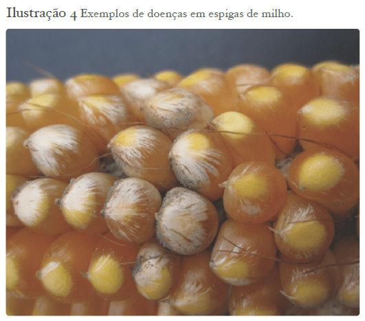 A partir do momento que a espiga de milho é exposta, diferentes doenças podem ocorrer. As doenças mais comuns são: podridão branca da espiga, podridão de aspergillus, podridão de fusarium, podridão de giberela, mofo do olho azul, entre várias outras doenças.