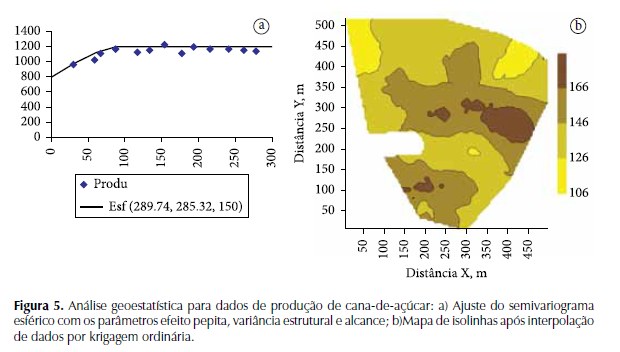 Na figura 5 são mostrados exemplos de ajuste de semivariograma e a construção do mapa para dados de produção de cana-de-açúcar.