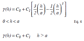 Onde C0, C1 e a são os parâmetros de ajuste, h a distância e γ (h) o valor da semivariância para o modelo de ajuste.