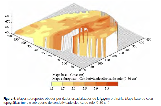 No exemplo da Figura 6 pode-se visualizar uma sobreposição de mapas para uma mesma área, onde o mapa base foi gerado a partir de dados espacializados de cotas topográficas (m) e o sobreposto, de condutividade elétrica do solo obtida com o sensor Veris (0-30 cm).