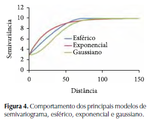 McBratney e Webster (1986) indicam que os modelos mais adequados para os mais variados tipos de situações, na maioria dos casos, serão esférico, exponencial ou gaussiano. A Figura 4 mostra o comportamento destes três modelos.