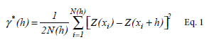 onde N(h) é o número de pares de valores medidos Z(xi), Z(xi+h), separados por um vetor h. Para que a variável avaliada tenha dependência espacial é necessário que o semivariograma seja crescente com a distância.