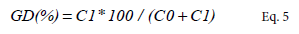 Após o ajuste do semivariograma e a obtenção dos parâmetros de ajuste Zimback (2001) estabeleceu uma relação entre o patamar e o efeito pepita em que indica o Grau de Dependência (GD) espacial (se fraco <25%, moderado >25% até 75%, forte > 75%) pode ser calculado seguindo a Equação 5: