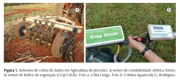 c) sensores das propriedades de solo que quantificam atributos como o conteúdo de matéria orgânica, pH, capacidade de troca catiônica, textura, umidade, nutrientes e contaminações. Incluem equipamentos como espectrômetros de infravermelho, condutivímetros elétricos por contato (Veris - Figura 1a) ou indução eletromagnética (EMI) e penetrômetros eletrônicos;