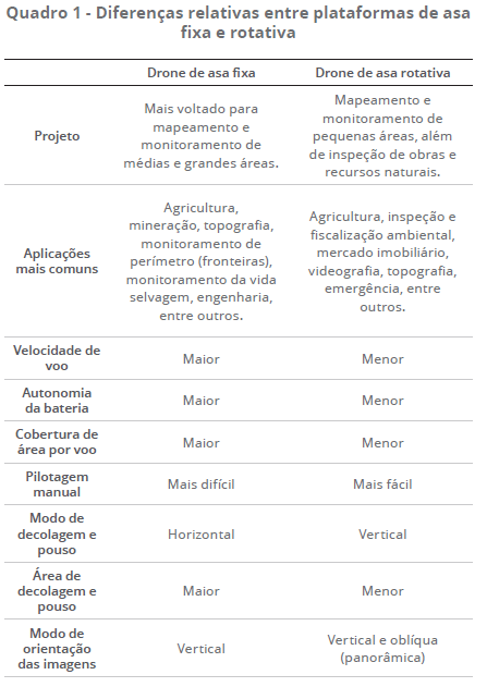 No Quadro 1, podem ser observadas as principais vantagens e desvantagens dos diferentes tipos de drone, segundo a asa, fixa ou rotativa.