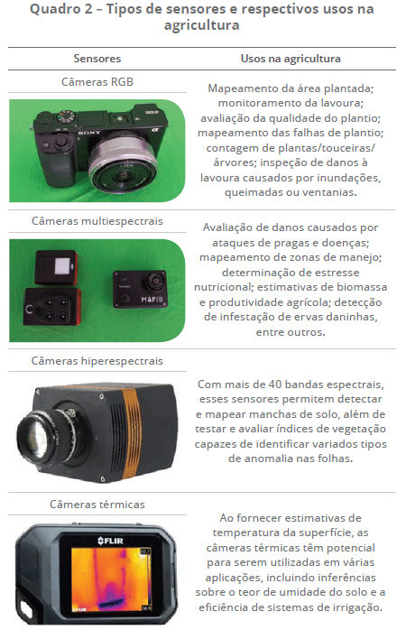 Problemas como falhas de plantio, estresse hídrico, competição com outras espécies e doenças das plantas podem ser identificados e mapeados a partir do uso combinado dessas tecnologias. Com isso, uma vez detectado o problema, o produtor rural poderá tomar decisões com mais assertividade, segurança e celeridade. Nesse contexto, os drones facilitam o levantamento de dados, fornecendo informações estratégicas aos agricultores. Sua aplicação na área agrícola vem sendo favorecida pelo avanço tecnológico, pela redução dos custos de equipamentos e softwares e, finalmente, pela crescente necessidade de otimização dos recursos de produção. Drone é um termo utilizado para se referir a uma aeronave sem piloto embarcado. Originalmente, essa palavra era usada apenas para os aviões militares não tripulados. Atualmente, serve para designar os aeromodelos radiocontrolados com mais de um rotor, como os quadricópteros.