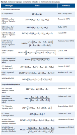 A Tabela 1 apresenta alguns dos índices de vegetação mais utilizados. Tucker (1979) estudou diferentes combinações lineares das bandas do verde, vermelho e NIR para monitorar propriedades como a biomassa, conteúdo de água na folha e conteúdo de clorofila.