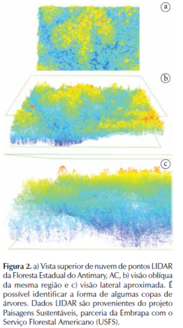 Este último sistema (LiDAR - Light Detection and Ranging) dispara pulsos de laser sobre o terreno e identifica os respectivos retornos, tornando possível saber com precisão as coordenadas X, Y e Z de pontos no terreno. Isso permite gerar “nuvens de pontos” (Figura 2), que podem ser utilizados para levantamentos topográficos (ZANARDI et al., 2013) e estudos de biomassa em florestas plantadas (SILVA et al., 2013) e manejo de florestas nativas (ARAUJO et al., 2013).
