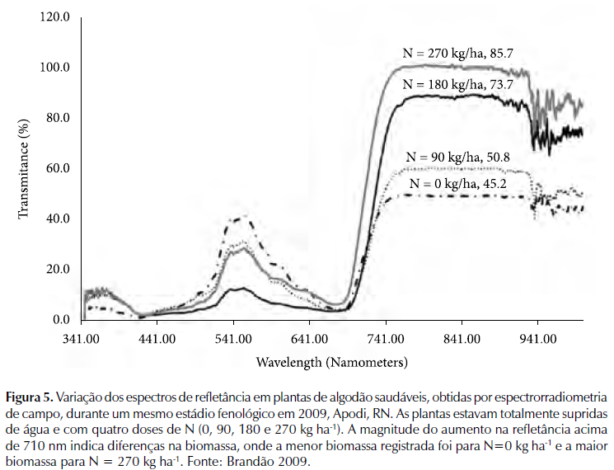 Com base neste conhecimento, pode-se utilizar dados de sensores remotos em níveis de campo, aéreo e orbital para avaliar e estimar o conteúdo de N nas plantas. Sabe-se que a diminuição da concentração dos pigmentos clorofilados, ocasionada pela carência em N, interfere na refletância espectral na região do espectro visível. Brandão (2009), num estudo para diferentes doses de nitrogênio no algodoeiro irrigado (0 Kg ha-1; 90 Kg ha-1; 180 Kg ha-1 e 270 Kg ha-1), percebeu significativo aumento no infravermelho com o incremento de nitrogênio (Figura 5).