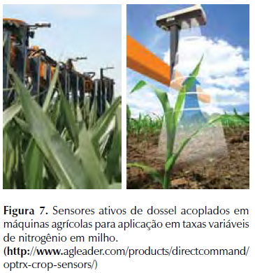 Ou seja, o sensor embarcado diagnostica o status de N da planta através dos IV e através de algoritmos específicos como os desenvolvidos por Solari et al. (2008); Dellinger, Schmidt e Beegle et al. (2008) e SHIRATSUCHI et al.(2011b) calcula-se a dose de fertilizante nitrogenado que deve ser aplicada em tempo real.