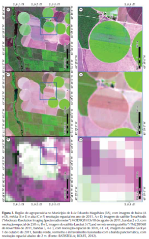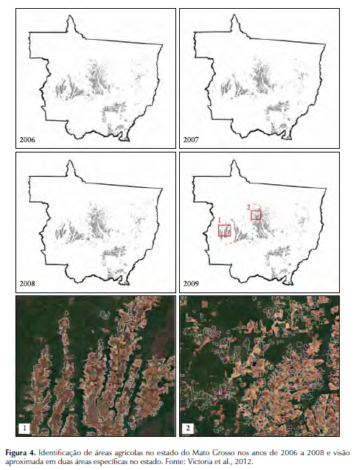 O SR é muito utilizado em aplicações relativas a estudos de uso e cobertura das terras e de características da vegetação. Neste campo são realizados diversos estudos e aplicações, como a avaliação das alterações no uso e cobertura das terras em diversos locais (QUARTAROLI et al., 2006; RODRIGUES et al., 2012; BATISTELLA et al., 2002 dentre outros), a avaliação de parâmetros biofísicos e de evapotranspiração da vegetação (ANDRADE et al., 2009, 2012; FACCO et al., 2012) e estudos da abrangência de áreas agrícolas e de sua dinâmica temporal (Figura 4) (JOHANN et al., 2012; VICTORIA et al., 2012; VICENTE et al., 2012).