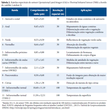 Sensores multiepectrais possuem bandas em diferentes faixas do espectro eletromagnético, cobrindo a faixa do visível, infravermelho próximo, médio e termal (Tabela 2). Também existem sensores com um número elevado de bandas contíguas, capazes de coletar informações do espectro eletromagnético de maneira contínua, os sensores hiperespectrais.