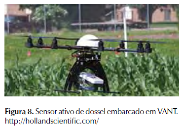 Até mesmo a utilização de ACS embarcados em VANTs já estão sendo utilizados como uma forma de mapeamento do status de N em milho (Figura 8).