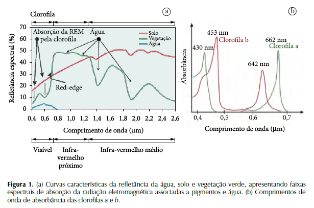 As clorofilas a e b regulam o comportamento espectral da vegetação de maneira mais significativa em comparação com outros pigmentos (Figura 1b). No NIR (750-1300 nm), dependendo do tipo de planta, a radiação solar é refletida numa proporção de 30 % a 80 % dos raios incidentes.