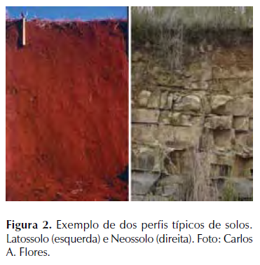 Como forma de ilustrar o SiBCS, se apresentam imagens de dois perfis contrastantes de solos, um Latossolo típico com significativa profundidade e um Neossolo Litólico originado de basalto com diaclase horizontal (Figura 2).