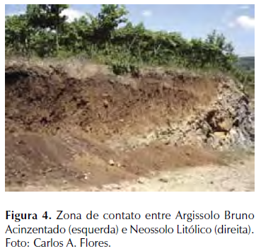 Note-se a diferença de profundidade de cada perfil, o Argissolo Bruno Acinzentado à esquerda do leitor, com tons marrom escuro e claro, que apresenta boa profundidade e o Neossolo Litólico na borda direita, cor cinza, com transição abrupta e muito escassa espessura.