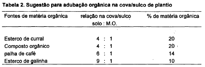 A Tabela 2 apresenta sugestão para a realização da adubação orgânica, que é baseada no volume de solo dentro da cova/sulco de plantio.