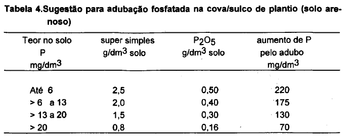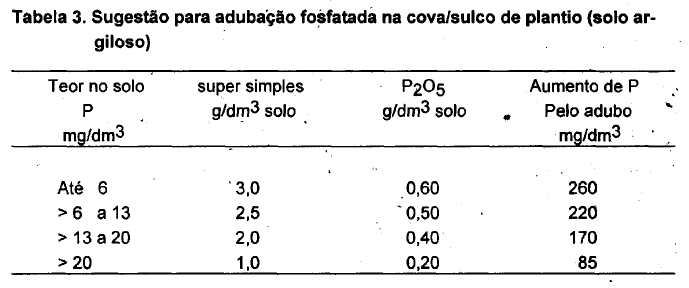 Na Tabela 3, é apresentada sugestão para aplicação de fertilizantes fosfatados. A indicação é baseada em análise de solo que se encontra na primeira coluna da Tabela.