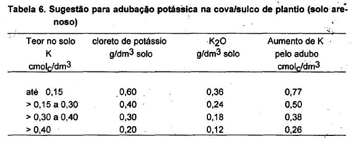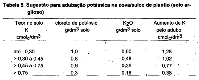 Na Tabela 5, é apresentada sugestão para a adubação potássica na cova/sulco de plantio em solo argiloso. A indicação é baseada no resultado de análise de solo.
