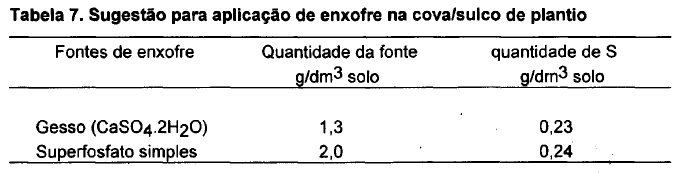 Nas plantas jovens, como é o caso das mudas nos dois primeiros anos do cafeeiro, o suprimento de enxofre pode ser feito com a utilização de matéria orgânica de boa qualidade e aplicação de superfosfato simples ou gesso na cova/sulco de plantio (Tabela 7).