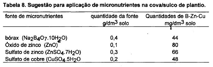 Diante desta situação indica-se a aplicação de micronutrientes conforme sugestão apresentada na Tabela 8.