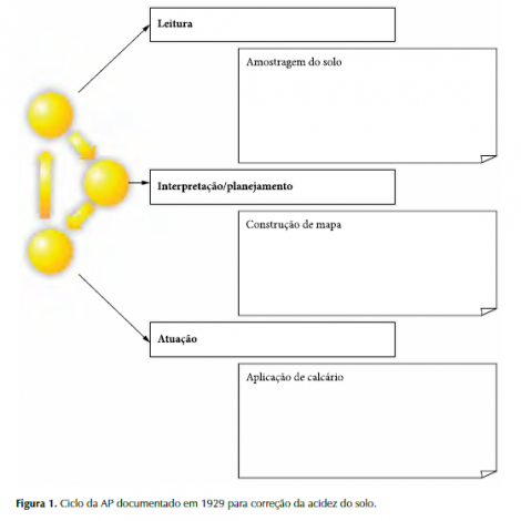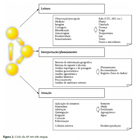 As literaturas como de Srinivasan (2006) e de Brase (2006) são didáticas e apresentam uma visão global da AP. Adamchuk et al. (2004) apresenta revisão de sensores de solo e Hatfield et al. (2008) explora um número extenso de trabalhos em sensoriamento remoto aplicado à agricultura, cujo conhecimento fundamenta a concepção dos sensores óticos encontrados hoje no mercado. Há muitos trabalhos que buscam desenvolver e propor ferramentas para o uso da AP, inclusive a robótica, mas apenas alguns estão disponíveis e bem sucedidos comercialmente, como as colhedoras, implementos com aplicação à taxa variada e amostrador de solo, todos com GNSS. A rede utilizou sensores óticos, medidor de condutividade elétrica, imagem aérea ainda de uso não muito disseminado entre os agricultores do Brasil. Porém, ainda há muitas lacunas tecnológicas a serem preenchidas. É comum organizar e descrever a AP como um sistema controlados e estes conceitualmente é apresentado em três etapas. O início determinado pela leitura, que consiste no levantamento e obtenção de dados. A segunda etapa é a de interpretação dos dados para planejamento das operações de campo. A terceira como a de atuação ou de execução do planejamento. Ao realizar essas três etapas, e elas reiniciam-se em ciclo. O que difere a AP dos demais ciclos de controle convencional é a localização da atuação e dos dados, ou seja, a análise e planejamento são realizados sobre mapas. Muito comum em gestão, o ciclo também é de melhoria contínua. Se um produtor detectar variabilidade espacial causada por máquinas e ele aprimorar o seu uso, o próximo ciclo pode ser o de melhorar o uso de fertilizantes e assim por diante. Identificar a variabilidade, analisar a causa é fundamental nesse processo. Nem sempre, como já mencionado anteriormente, a gestão da variabilidade traz retorno econômico, porém, traz subsídios para melhorar o entendimento da lavoura.
