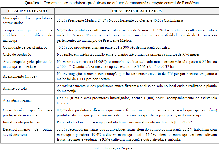 Incialmente, antes mesmo da apresentação das informações sobre aprodutividadedo maracujá na região central de Rondônia –Amazônia Ocidental –para uma melhor compreensão sobrea realidade produtiva do fruto na região, foram realizadoslevantamentosde dadosque se jugam importantes para a pesquisa, especialmente para utilização posterior na análise estatística do estudo. Assim, são apresentados no Quadro1um resumo dos principais achados relativos as características produtivas do maracujá na região.
