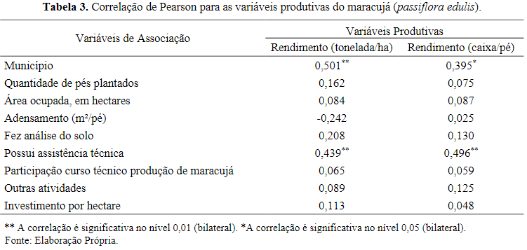 Adicionalmente, as variáveis produtivas apuradas também foram submetidasa análise de correlação de Pearson, conforme apresentado na Tabela 3.