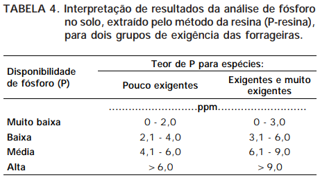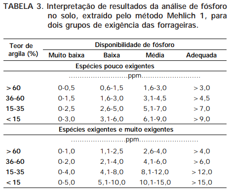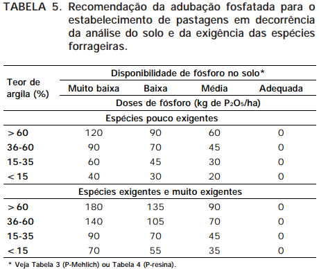 Nas Tabelas 1 e 2, apresentam-se as espécies segundo a sua exigência em fertilidade do solo e nas Tabelas 3 e 4, as interpretações de resultados de análise de fósforo no solo, baseadas nos teores de argila e segundo o grau de exigência das espécies. Nas Tabelas 5 e 6, fazem-se as recomendações, respectivamente, de P e potássio (K) para estabelecimento de pastagens, segundo as características do solo e as exigências das forrageiras.