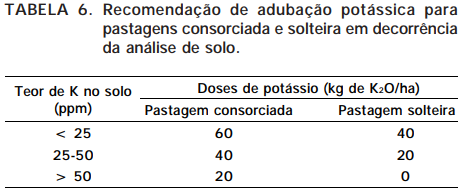 Para pastagem consorciada não se recomenda o N, devendo-se acrescentar micronutrientes à adubação acima indicada para pastagens exclusivas de gramíneas. Particularmente, o Mo deve ser incluído nas adubações periódicas com P, K e S.