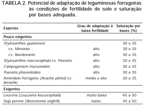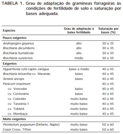 Existem graus diferenciados de adaptação das plantas às condições adversas do solo ou exigências diferentes quanto à fertilidade do solo, entre as espécies e dentro delas. Para fins práticos e considerando as espécies mais comumente plantadas na região do Cerrado, são propostos três grupos para gramíneas (Tabela 1) e dois grupos para leguminosas (Tabela 2), segundo o nível de exigência e indicações dos respectivos graus de adaptação à baixa fertilidade do solo. Os diferentes graus de adaptação das forrageiras às condições de fertilidade do solo foram criados considerando, principalmente, a acidez e a disponibilidade de fósforo.
