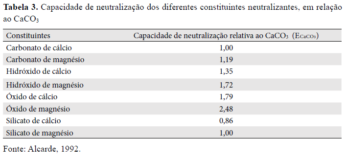 Esses materiais têm diferenças no poder de neutralização da acidez do solo. A tabela 3 mostra a capacidade de neutralização dos diferentes materiais relativamente ao carbonato de cálcio.