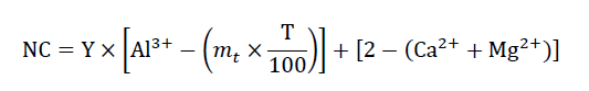 No cálculo da necessidade de calagem (NC), além das características relacionadas ao poder tampão do solo (Y) e as exigências da cultura, como a saturação por Al3+ tolerada (mt) e a necessidade mínima de Ca2+ + Mg2+