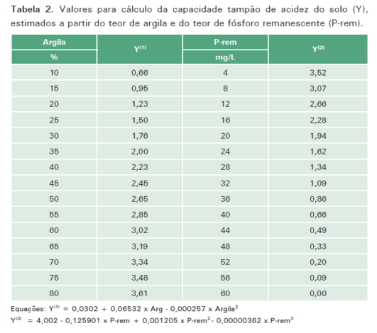 O valor de Y pode ser calculado em função do teor de argila ou do fósforo remanescente (P-rem) e estão apresentados na Tabela 2.