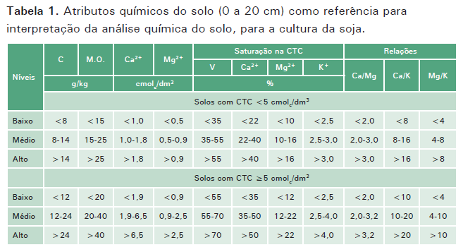 Em função das características químicas e físicas dos solos predominantes no País, tem-se uma variação no valor adequado de saturação por bases (V2), que determinará o maior rendimento econômico. Nas áreas tradicionais de cultivo de soja no estado do Paraná e para o estado de São Paulo utiliza-se V2 igual a 70% e para o estado de Mato Grosso do Sul, o V2 é de 60%. Nos demais estados da região central do Brasil, com predominância de solos formados sob vegetação de Cerrados e ricos em óxidos de Fe e de Al (Sousa; Lobato, 2004), o valor que satisfaz a maioria das culturas de sequeiro é de 50%.