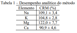 Foi executado ensaio de exatidão através da análise de material de referência certificado (CRM) Peach Leaves (NIST 1547) para avaliar o desempenho analítico. Os resultados encontrados foram considerados satisfatórios para todos os elementos e estão dispostos na Tabela 1.