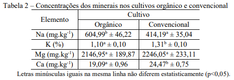 Os valores médios de concentração de cada nutriente nas amostras de cultivo orgânico e convencional são apresentados na Tabela 2.