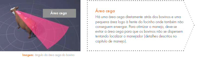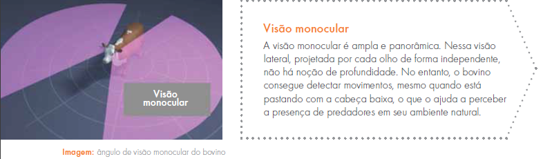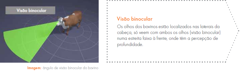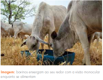- Bovinos enxergam, claramente e com noção de profundidade, apenas em uma estreita área a sua frente (visão binocular) e têm visão lateral ampla e panorâmica para detectar movimentos, embora sem detalhes (visão monocular);