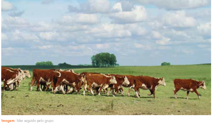 A liderança está presente no grupo dos bovinos. Um animal líder é aquele que é seguido pelos demais quando se desloca à procura de água, sombra, área de pastagem ou outro recurso. Normalmente, os líderes são fêmeas mais velhas na espécie bovina, no entanto o movimento do grupo pode ser iniciado por diferentes animais, em diversas circunstâncias.