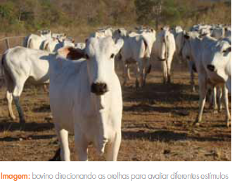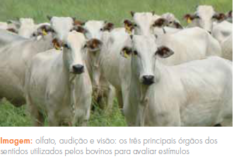 Bovinos dependem principalmente dos sentidos: visão, olfato e audição para avaliar estímulos e, assim, responder a diferentes situações, como mudanças no ambiente e ameaças. Ao se depararem com um barulho repentino, sua primeira reação é evitá-lo, ou seja, fugir. Após avaliar a situação, se não for perigosa, o bovino perderá o interesse.