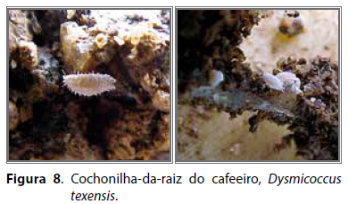 Dysmicoccus texensis: São insetos com fêmeas adultas ápteras, corpo ovalado e coloração rosada, recoberto com cerosidade branca finamente granulada, o que lhe confere o aspecto de farinha e cerca de 2,5 mm de comprimento. Possuem 34 apêndices filamentosos ao redor do corpo, com 17 de cada lado, sendo os dois últimos mais longos (SANTA-CECÍLIA et al., 2007). Sua reprodução é partenogenética, podendo gerar até 253 indivíduos durante período de 52 a 87 dias. A temperatura mais favorável ao desenvolvimento populacional é de 20 a 25 ºC e associada à umidade relativa elevada, com até cinco gerações anuais (NAKANO, 1972). As primeiras infestações surgem em pequenas colônias logo abaixo do colo de plantas novas. Com o desenvolvimento da população, o inseto vai se disseminando para as raízes da planta, formam nodosidades denominadas criptas, no interior das quais vivem suas formas jovens e adultas associadas a fungo do gênero Bornetina, que confere um aspecto de placa sobre as raízes (Figura 8).