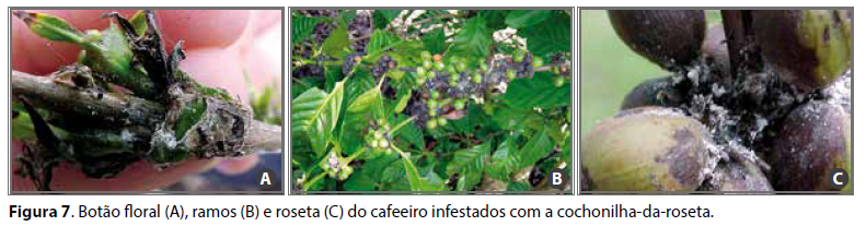 As cochonilhas-da-roseta têm aumentado sua importância pelos prejuízos diretos à produtividade do cafeeiro conilon (FORNAZIER et al., 2004). Seu ataque ocorre diretamente aos botões florais e aos frutos em formação e crescimento, ocasionando sua acentuada queda. Provoca o chochamento de frutos mais desenvolvidos (FORNAZIER et al., 2000g, 2001a).