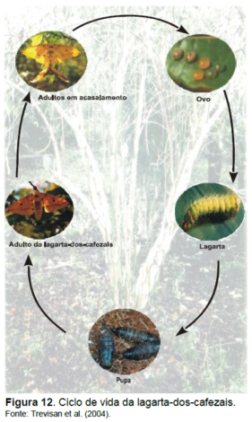 A duração média aproximada, em dias, para cada uma das fases do ciclo biológico (Figura 12) é a seguinte: ovo – 12; lagarta – 37; pupa – 35 e adulto – 5 e 7, para macho e fêmea, respectivamente. O ciclo biológico da lagarta-dos-cafezais é em média 90 dias, contado a partir da postura até a morte do adulto. No Sudeste, o período prolonga-se no inverno, quando a pupa entra em diapausa (CROCOMO, 1977; PARRA et al., 1992). Em Rondônia, a diapausa ocorre em dois períodos do ano: chuvoso, de novembro a março, e no período de estiagem, de maio a agosto (TREVISAN et al., 2004). A capacidade de postura das fêmeas é de aproximadamente 198 ovos, decrescendo da primeira à última postura (CROCOMO, 1977).