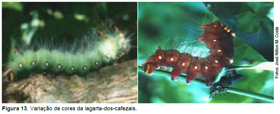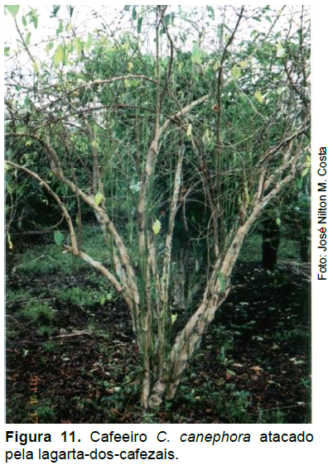 Dependendo das condições ecológicas, a lavoura pode ser devastada pela lagarta-dos-cafezais. Essas lagartas são responsáveis pela destruição, principalmente da parte superior da planta (Figura 11). Os danos causados são relevantes em virtude do número de lagartas que pode ocorrer por planta, chegando a 150, e ao tamanho avantajado das mesmas (TREVISAN et al., 2004). Uma lagarta pode consumir 0,30 m2 de área foliar (CROCOMO, 1977).