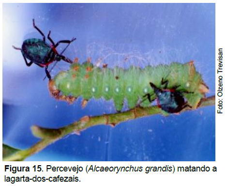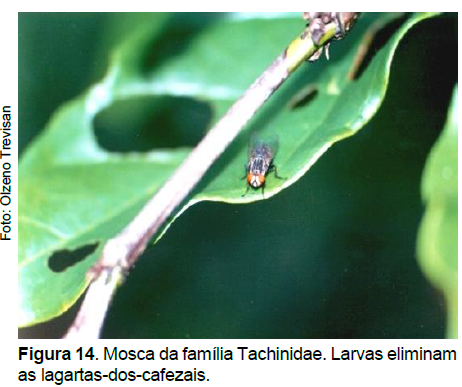 As lagartas que atacam o cafeeiro são geralmente controladas biologicamente por seus inimigos naturais (parasitoides e predadores) (Figuras 14 e 15), encontrados nos cafezais à procura de seus hospedeiros. O uso indiscriminado de inseticidas, visando controle de pragas, elimina esses inimigos naturais, com consequentes surtos destas e também de outras espécies de lagartas que normalmente não atacam o cafeeiro (REIS; SOUZA, 1986).