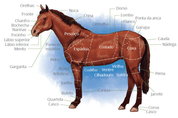 Possui cinco pontos fundamentais: cernelha, dorso, lombo, garupa e peito. Os membros anteriores e posteriores, também chamados de mãos e pés, apresentam, em suas extremidades finais, os cascos.